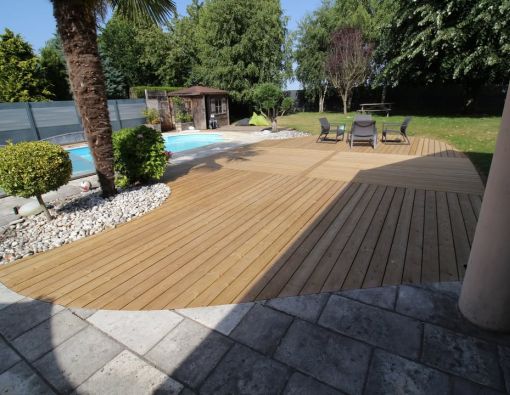 Réalisation d'une magnifique terrasse en pin pour profiter des repas de famille ou des soirées entre ...
