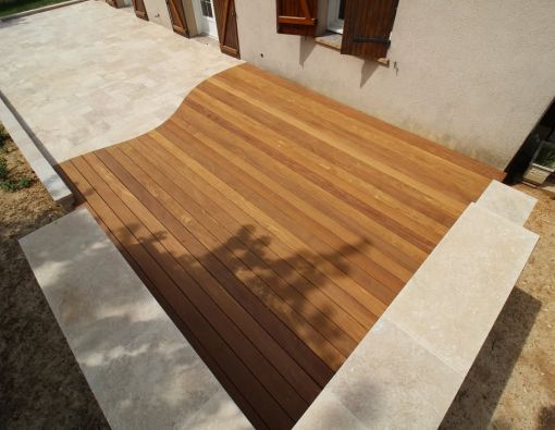 Rénovation complète d'un extérieur de maison avec terrasse mixte en pierre opus travertin et bois ex ...